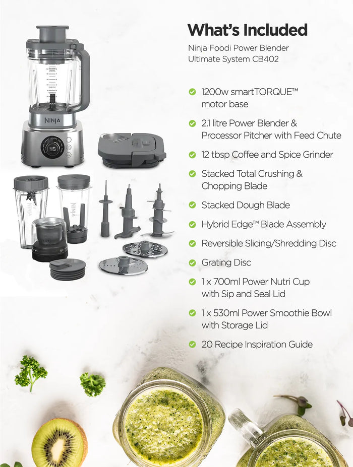 The Ninja Foodi Power Blender Ultimate System with XL Smoothie Bowl Maker and Nutrient Extraction Cup is Ninja’s most versatile and powerful kitchen system – slice and shred with no extra processor bowl required.