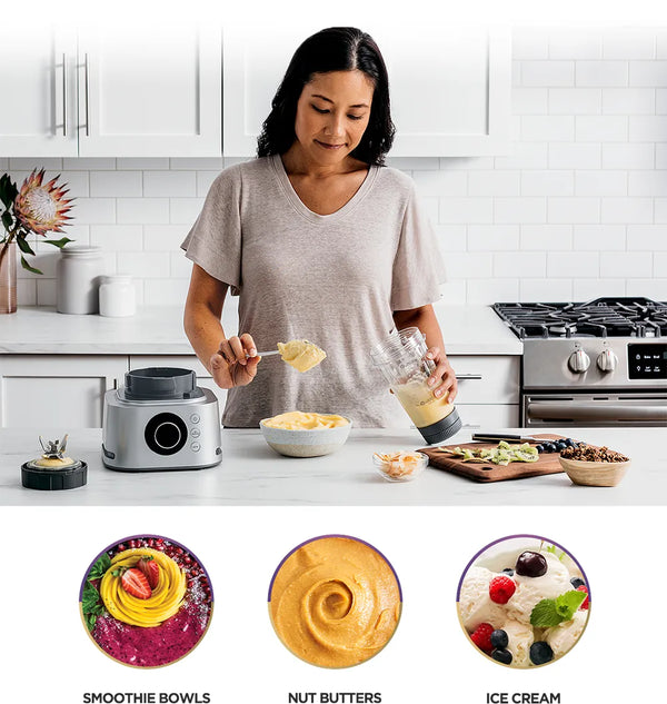 XL Power Smoothie Bowl with built-in tamper powers through frozen foods with less liquid for perfectly thick smoothie bowls, nut butters, and ice cream.