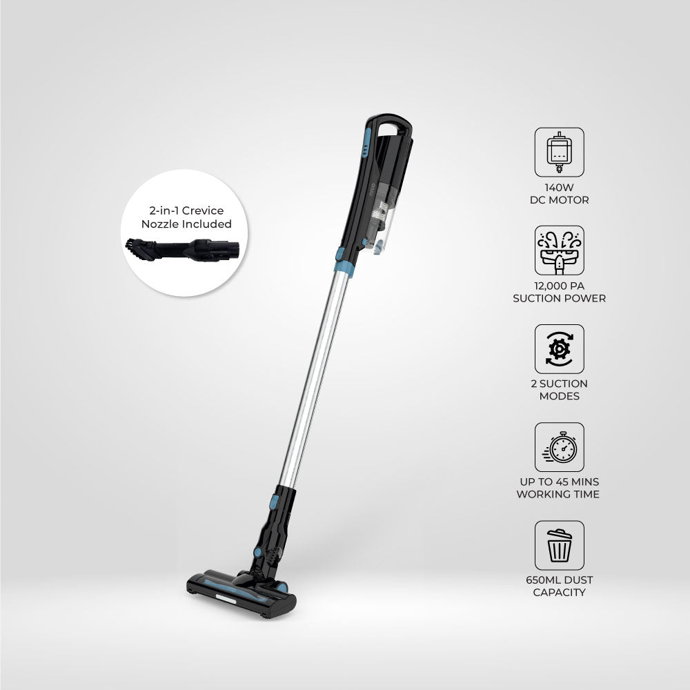 NNIO's Cordless Stick Vacuum Cleaner (N6660SVC) offers 12,000 PA suction power, two modes, a 650ml dust capacity and up to 45 minutes of runtime. Its HEPA filter ensures efficient cleaning, while cordless convenience provides flexibility for various cleaning tasks.