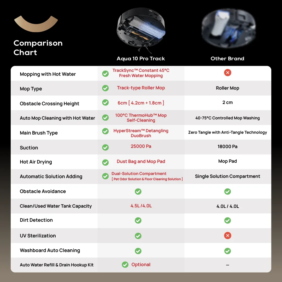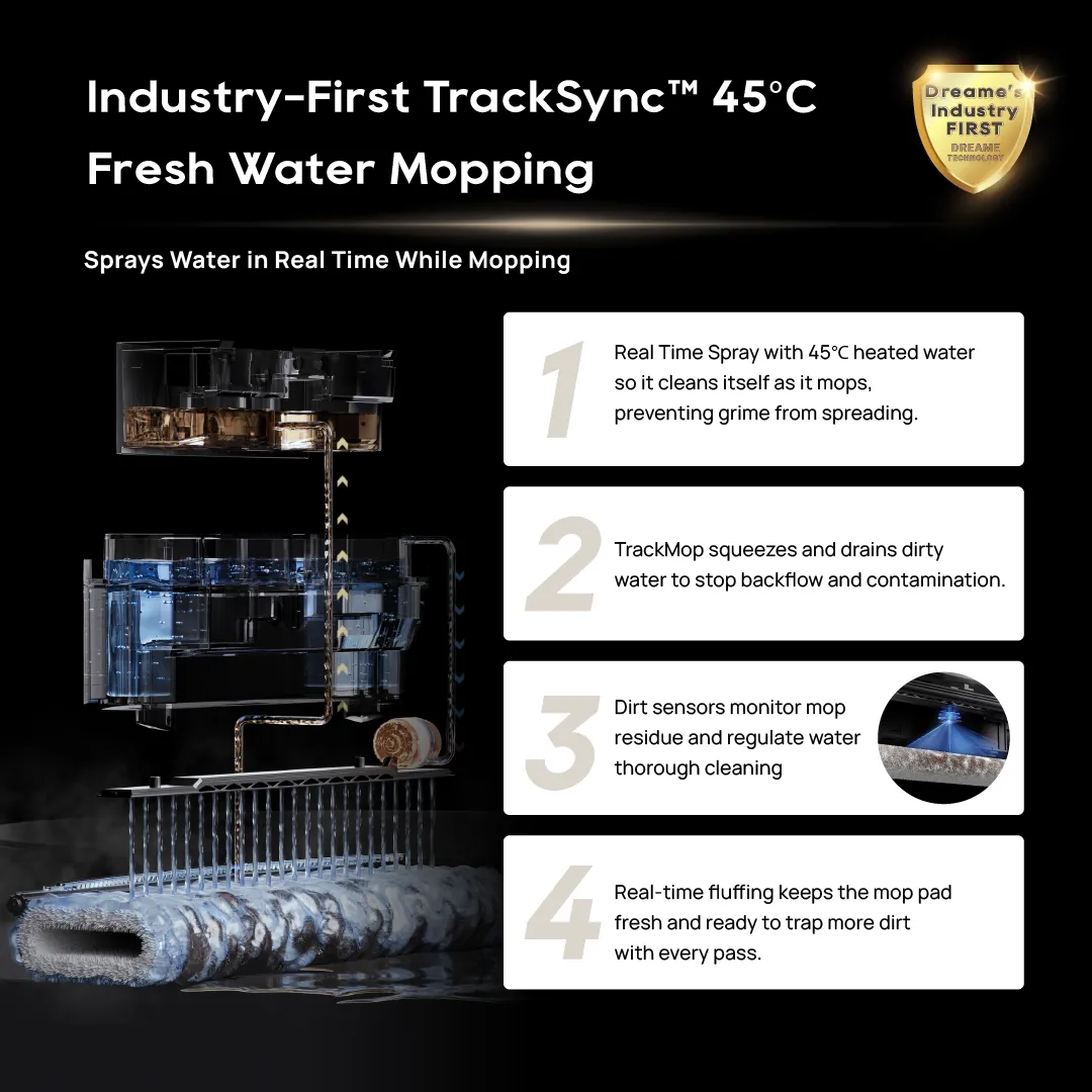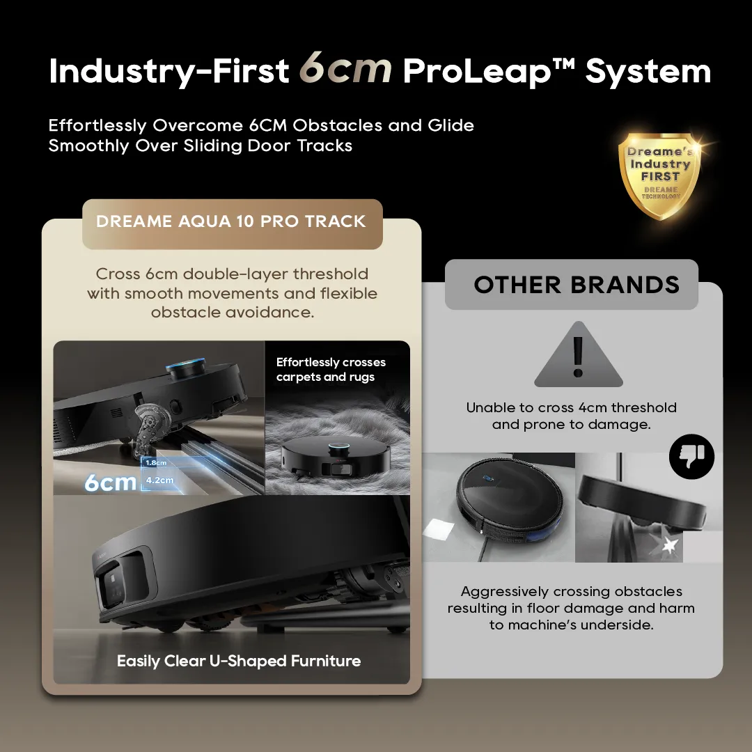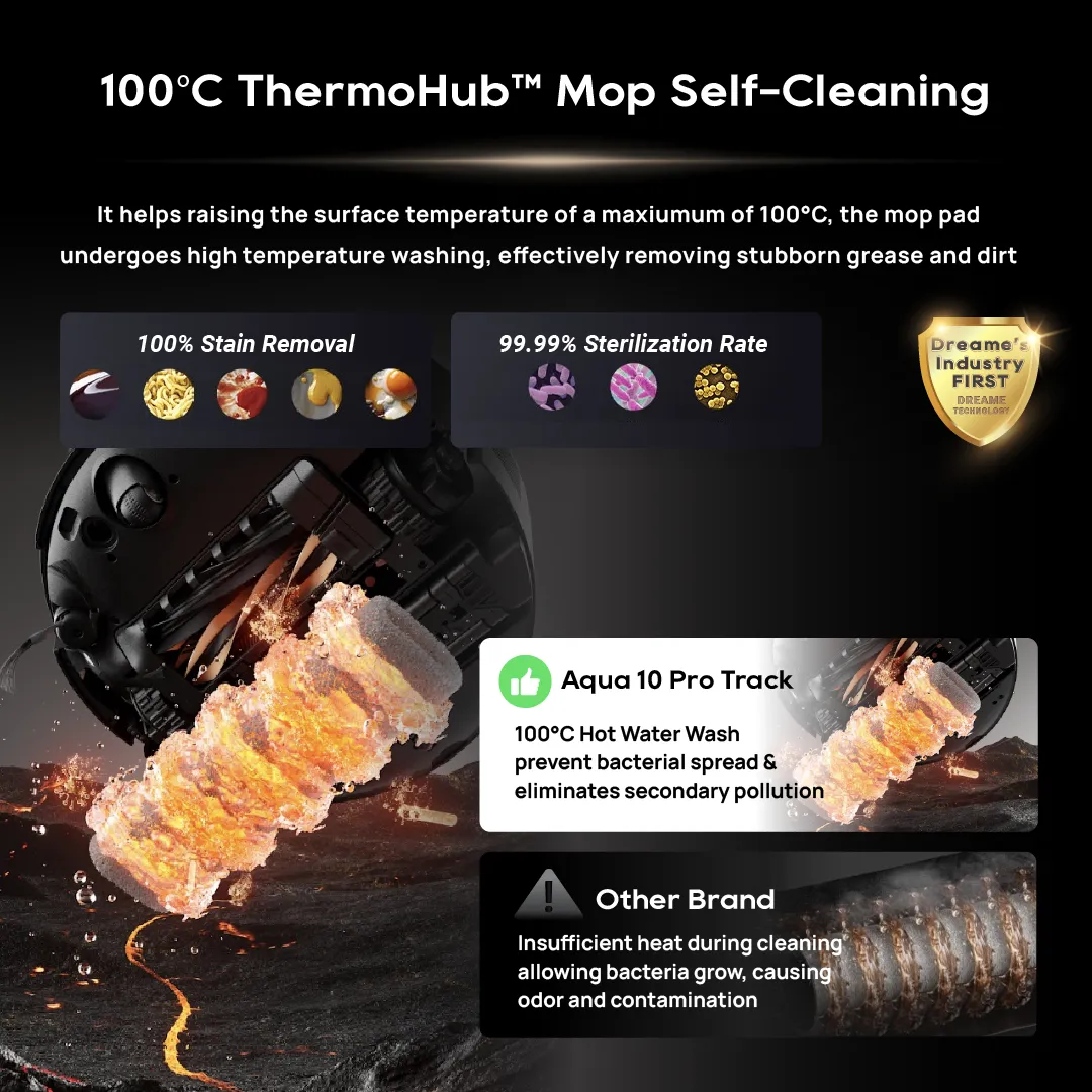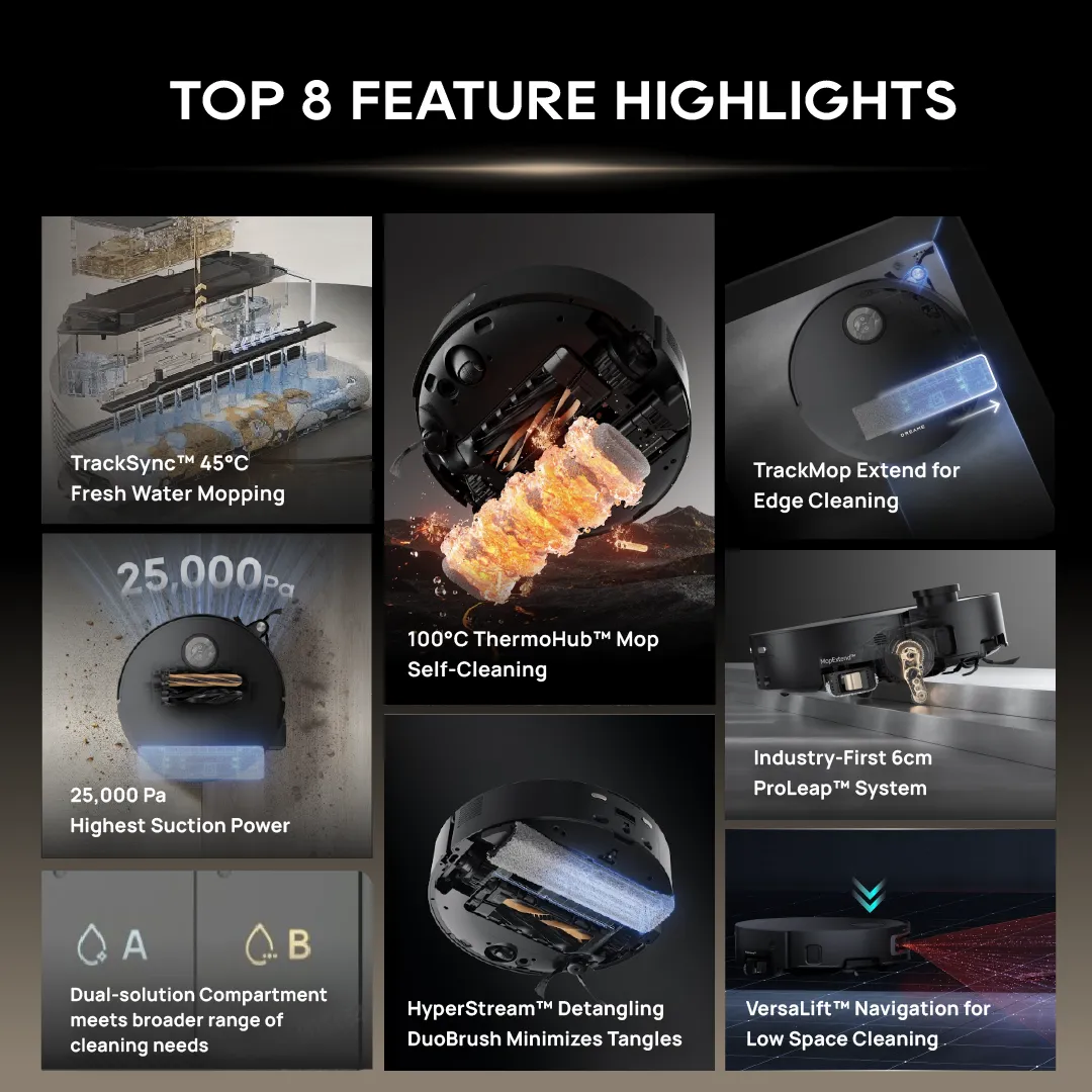 BEST-SELLING flagship robot vacuum & mop that sets a new benchmark in floor cleaning. It's the first robot to feature a Track-type Roller Mop with real-time fresh water spray, delivering superior mopping performance with wider floor coverage and enhanced contact—outperforming traditional mops. It can easily cross 6CM obstacles and glide over sliding floor tracks with ease. FIRST robot that can identify over 240 objects with its VersaLift DToF. Superior hair tangle removal with HyperStream Detangling DuoBrush, no leakage of hair unlike other brands with DuoDivide Brush. The advanced 100℃ ThermoHub Mop Self-Cleaning system provides high-temperature washing of the mop pads, effectively breaking down stubborn grease and dirt. This process not only ensures hygienic cleaning but also prevents bacterial buildup and secondary contamination.
