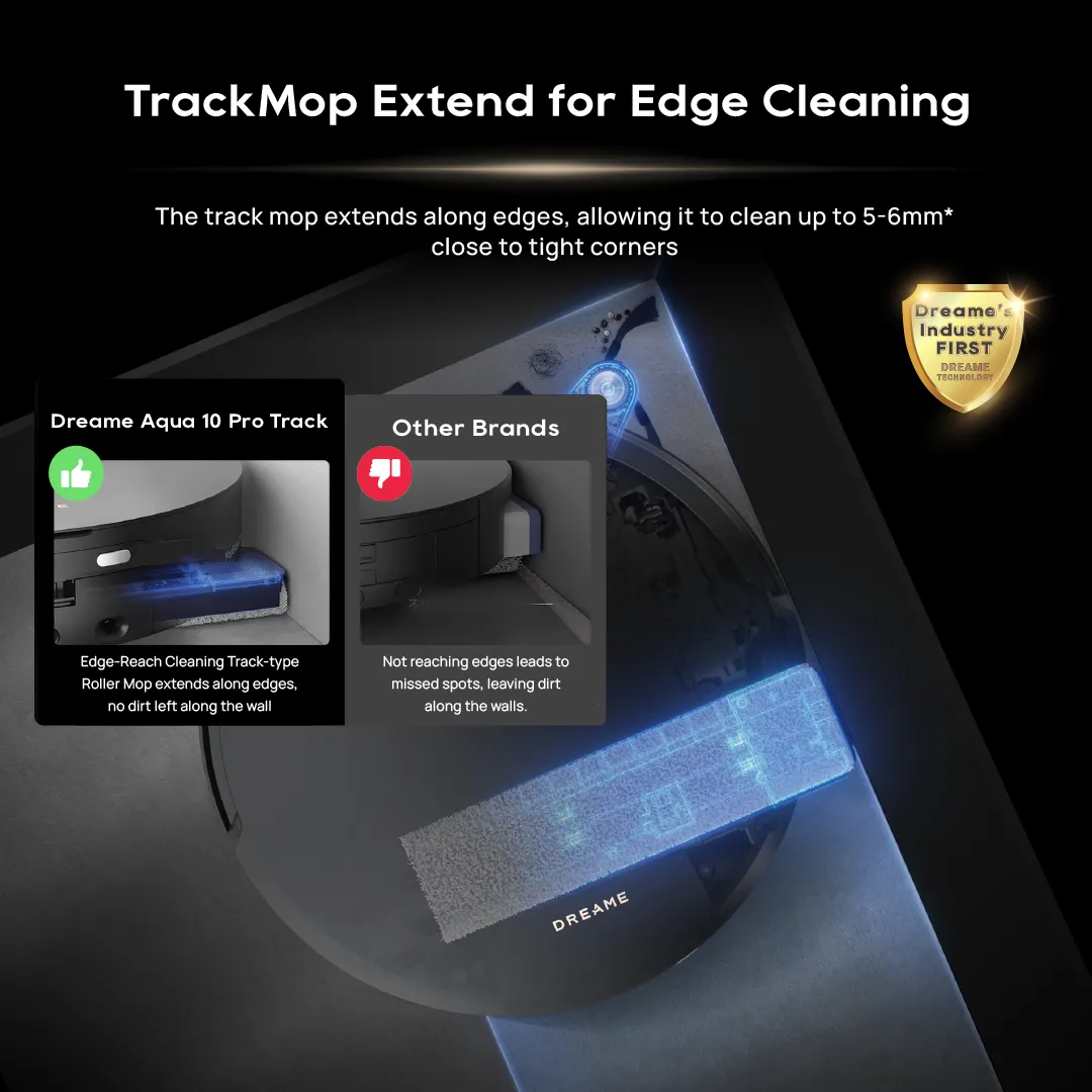 Track mop extends along edges, allowing it to clean up to 5-6mm* close to tight corners.