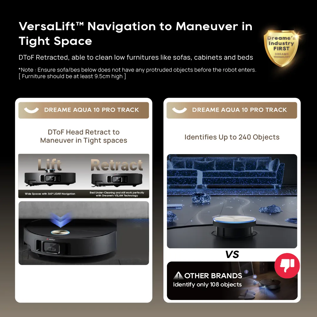 DToF Retracted = Able to clean low furnitures like sofas, cabinets & beds (Maneuver in Tight Spaces)