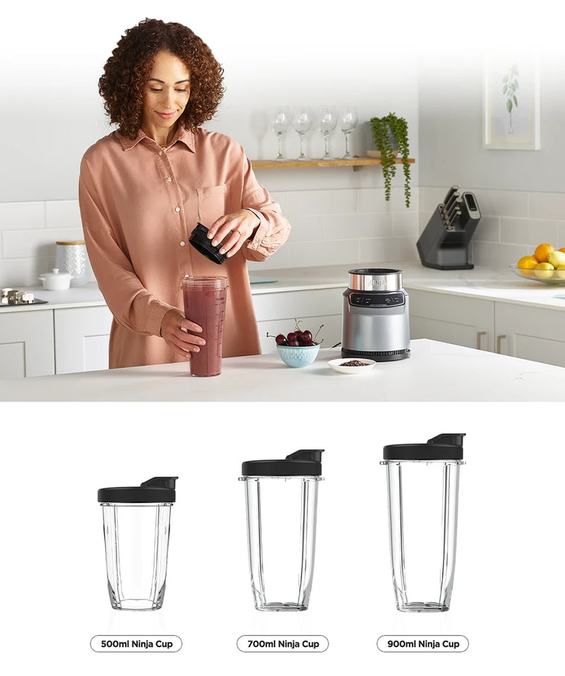 Blend inside one of the three included Single-Serve Ninja Cups then twist on a Spout Lid for easy on-the-go drinking.