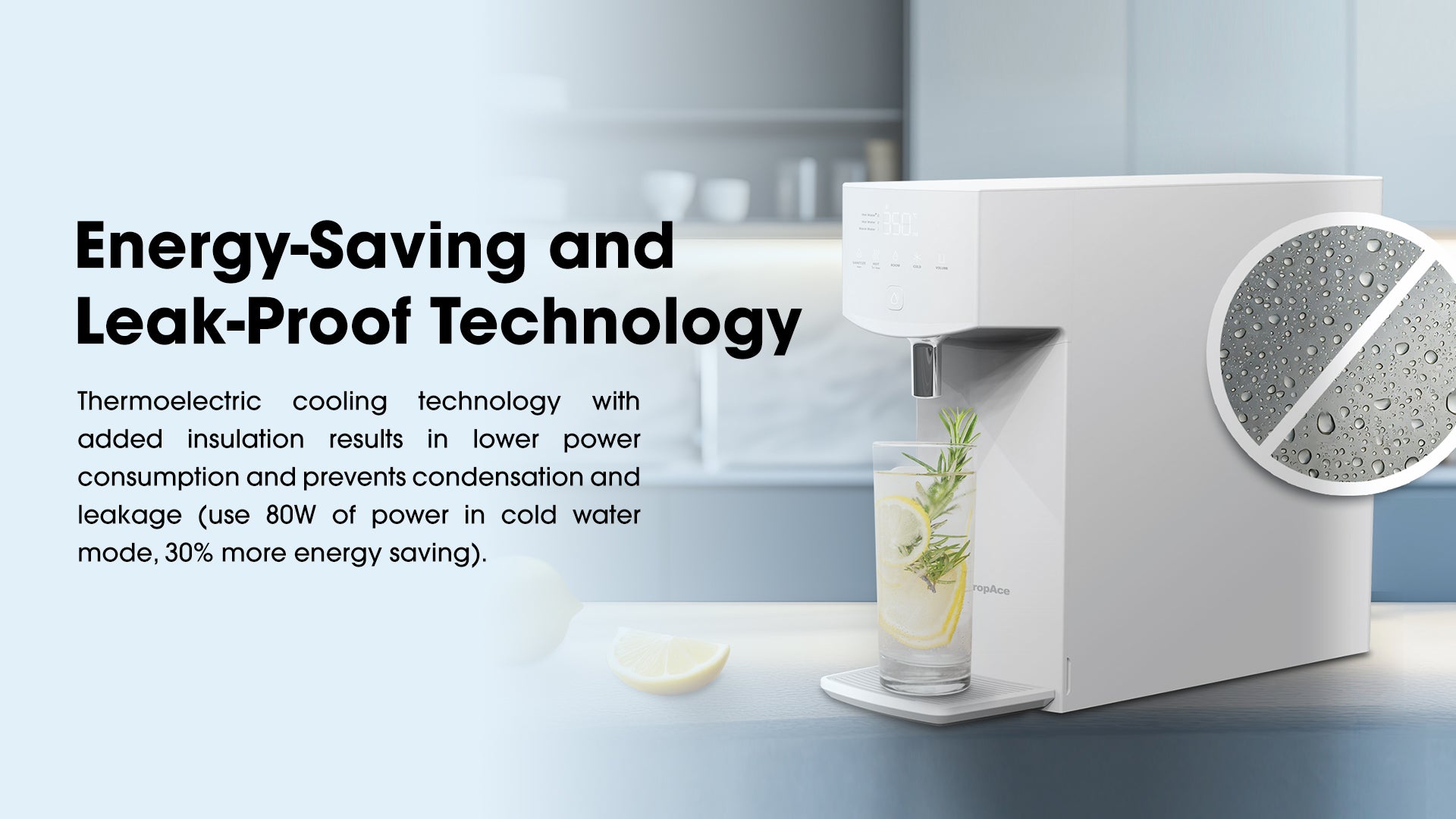 Thermoelectric cooling technology with added insulation results in lower power consumption and prevents condensation and leakage (use 80W of power in cold water mode, 30% more energy saving)