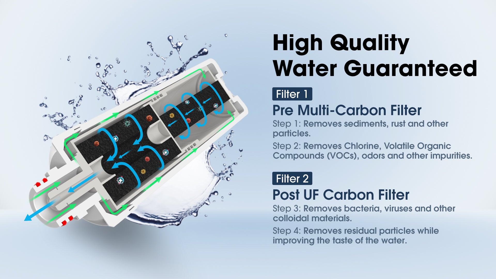 Pre Multi-Carbon and Post UF Carbon Filtration removes 99.99% of sediments, rust, bacteria, viruses and other contaminants while improving the taste of the water.