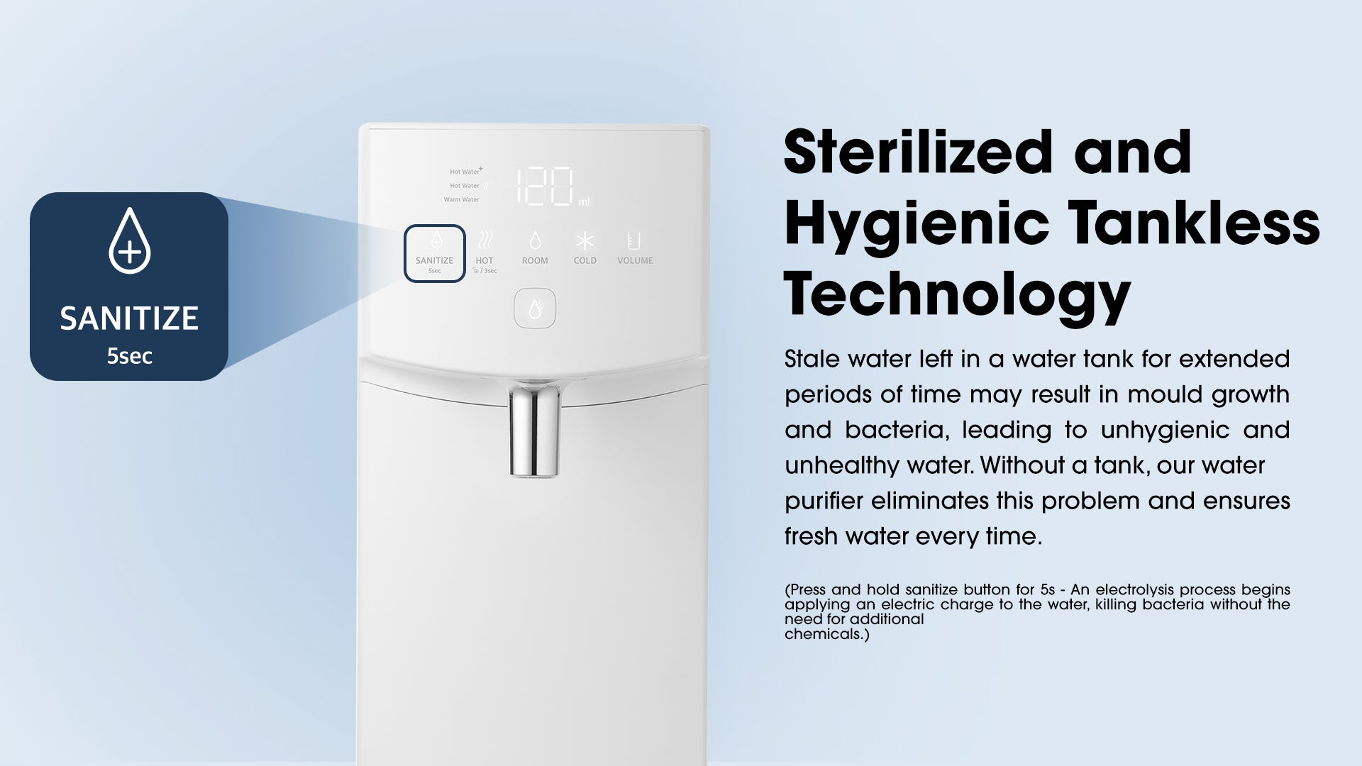 (Press and hold sanitize button for 5s - An electrolysis process begins applying an electric charge to the water, killing bacteria without the need for additional chemicals.)