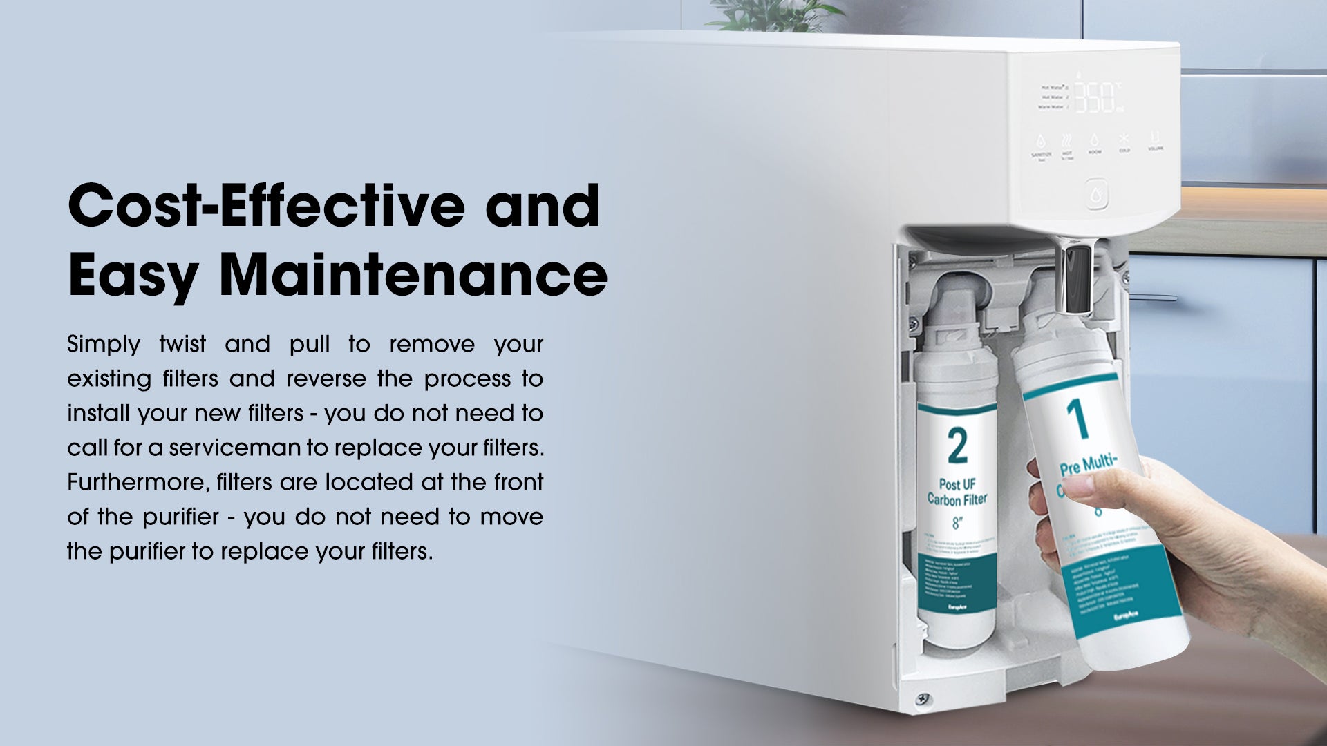 Simply twist and pull to remove your existing filters and reverse the process to install your new filters - you do not need to call for a serviceman to replace your filters. Furthermore, filters are located at the front of the purifier - you do not need to move the purifier to replace your filters.