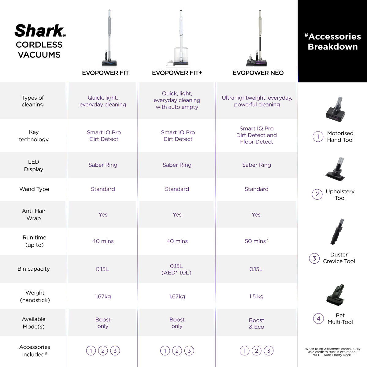 Weighing just 1.67kg, the Shark Evopower System Fit & Fit+ pack serious cleaning power into a lightweight design. Equipped with Smart IQ Dirt Detection and an advanced brushless PowerFins cleaner head with anti-hair wrap technology, these vacuums automatically adjust suction and maintain deep, continuous contact with every floor—delivering effortless, powerful cleaning.