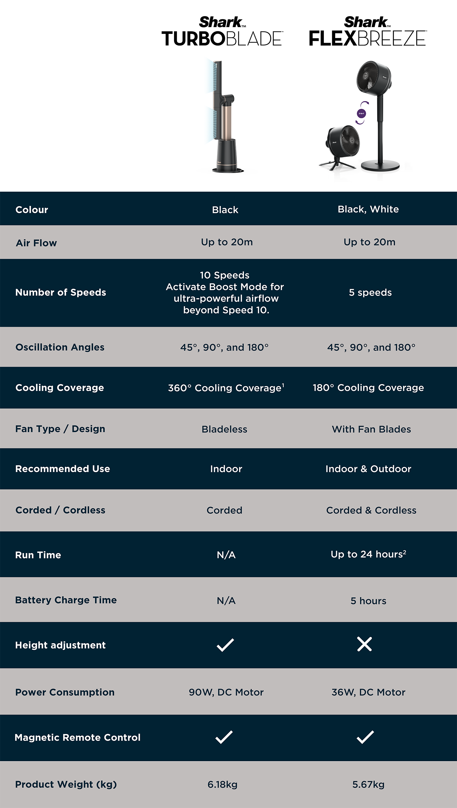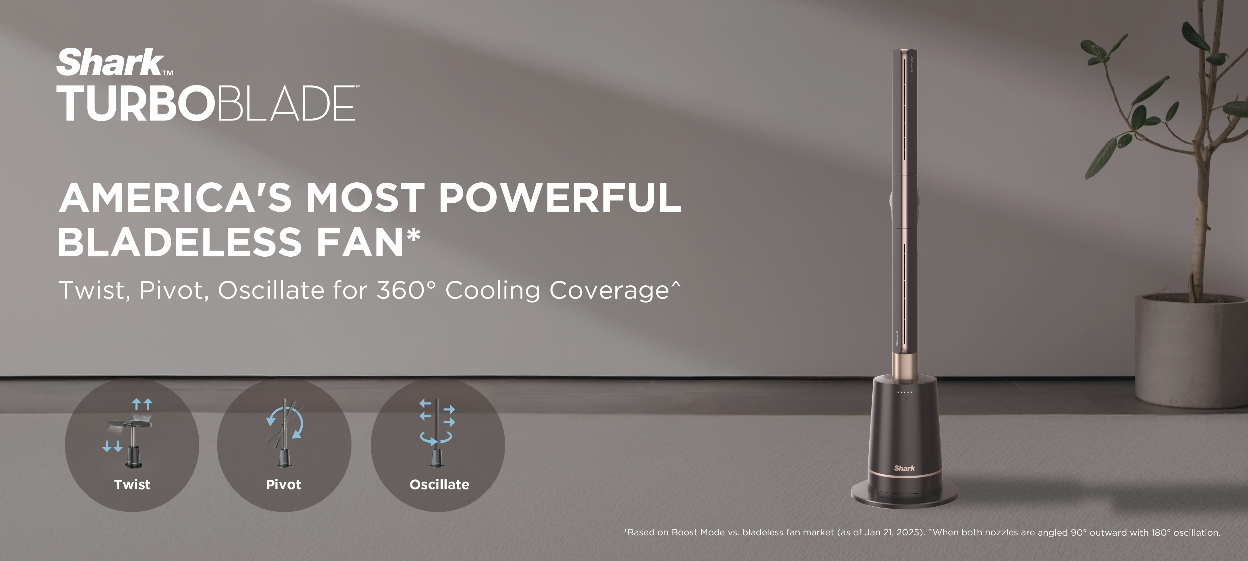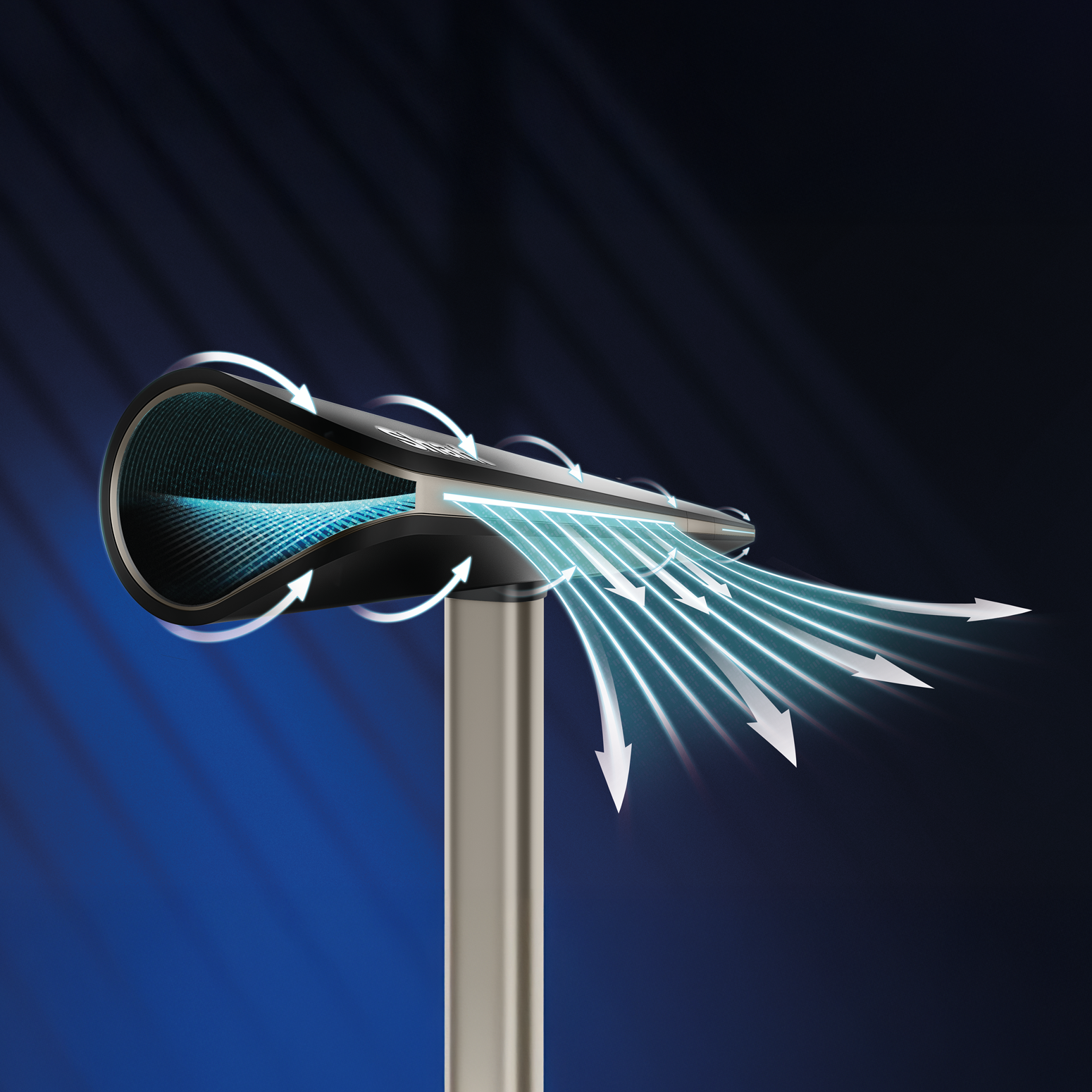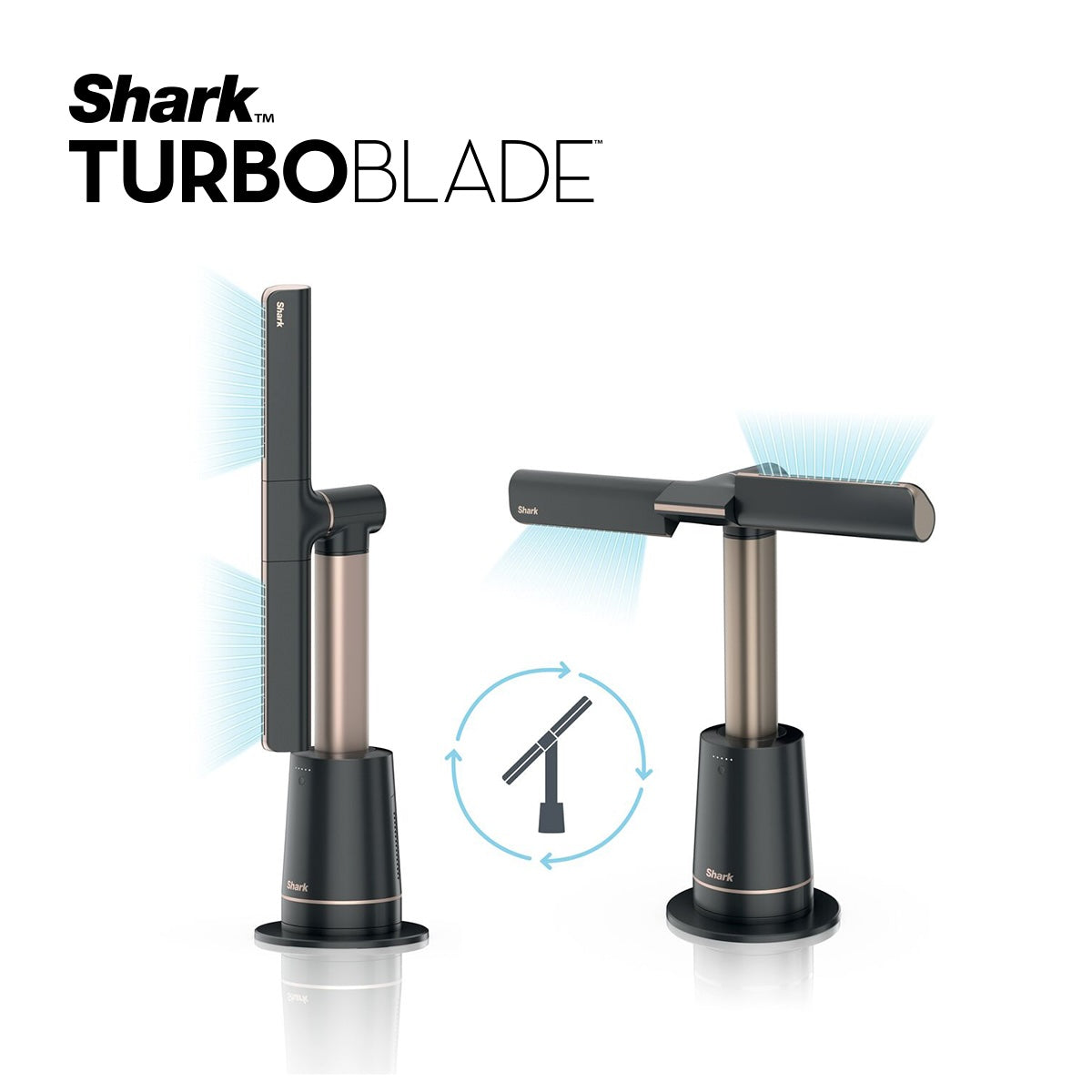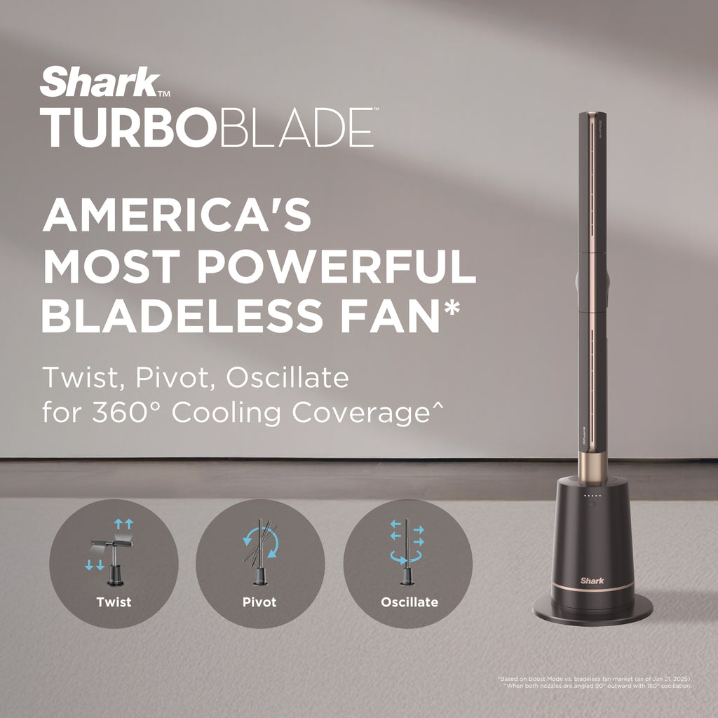 The Shark TurboBlade™ features a bladeless design powered by internal high-velocity airflow technology. Instead of exposed blades, air is drawn in and channeled through precision-shaped vents — delivering smooth, powerful, and continuous airflow in a sleek, safe de