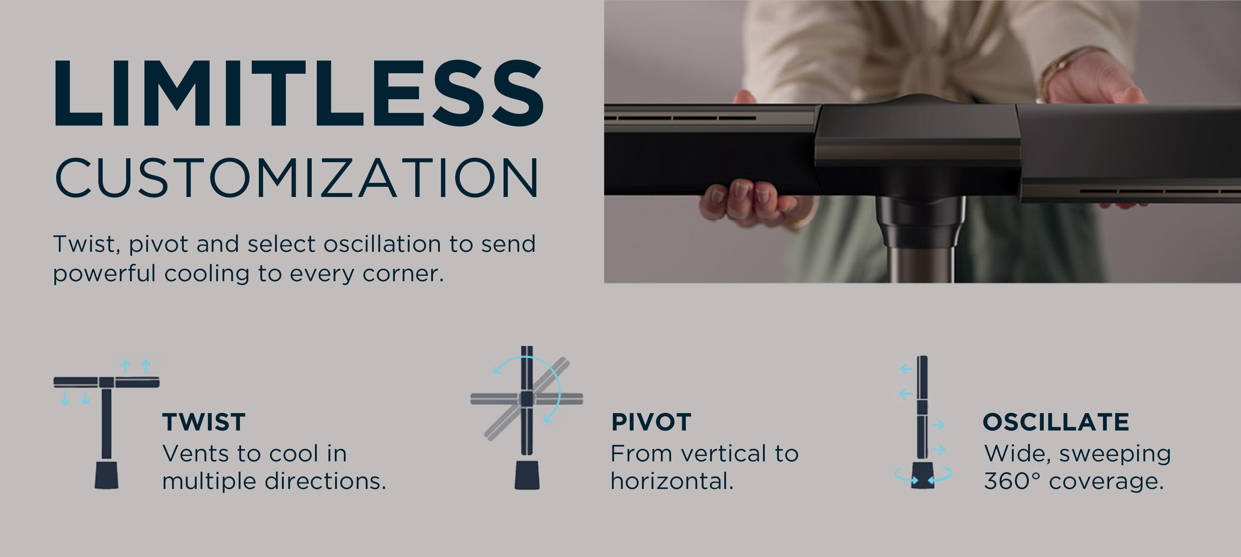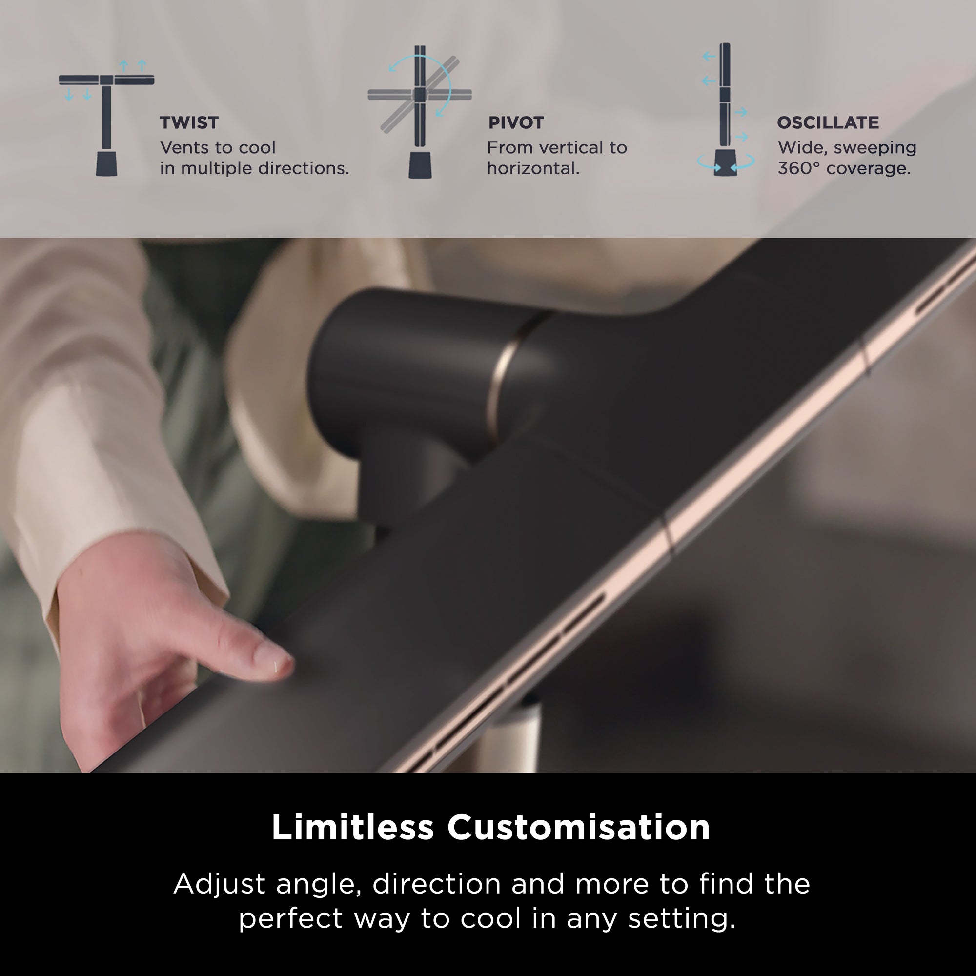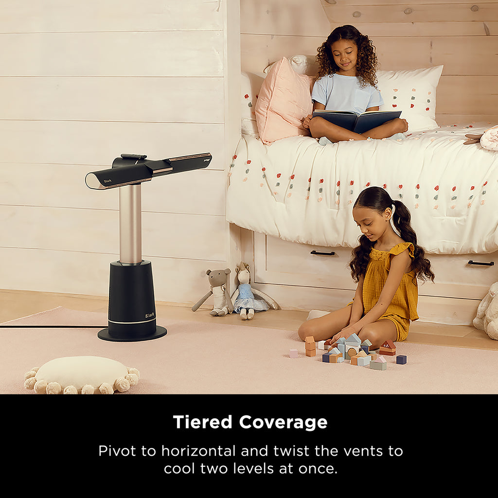 Pivot horizontally and twist each nozzle to direct airflow across two levels - cooling from floor to ceiling at once.
