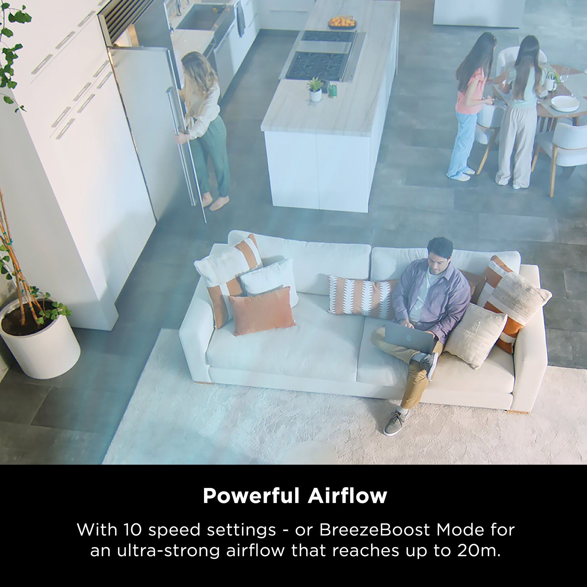 Feeling the heat and need extra cooling power? Activate BreezeBoost Mode for ultra-powerful airflow beyond Speed 10 - reaching up to 20m. Perfect for large rooms and those extra hot days.