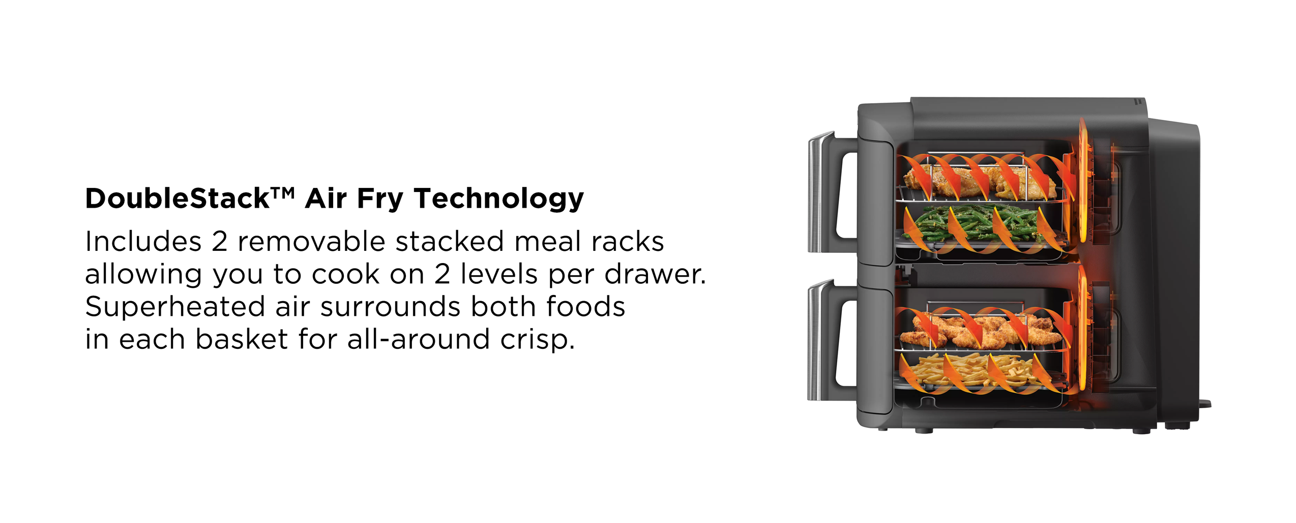 With two baskets for four different dishes, the Ninja DoubleStack™ XL Air Fryer satisfies every craving in one go.