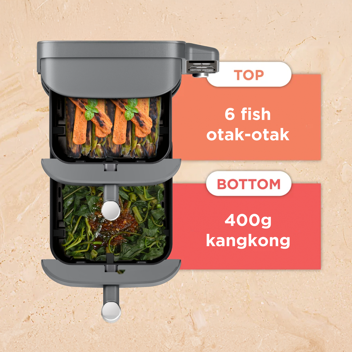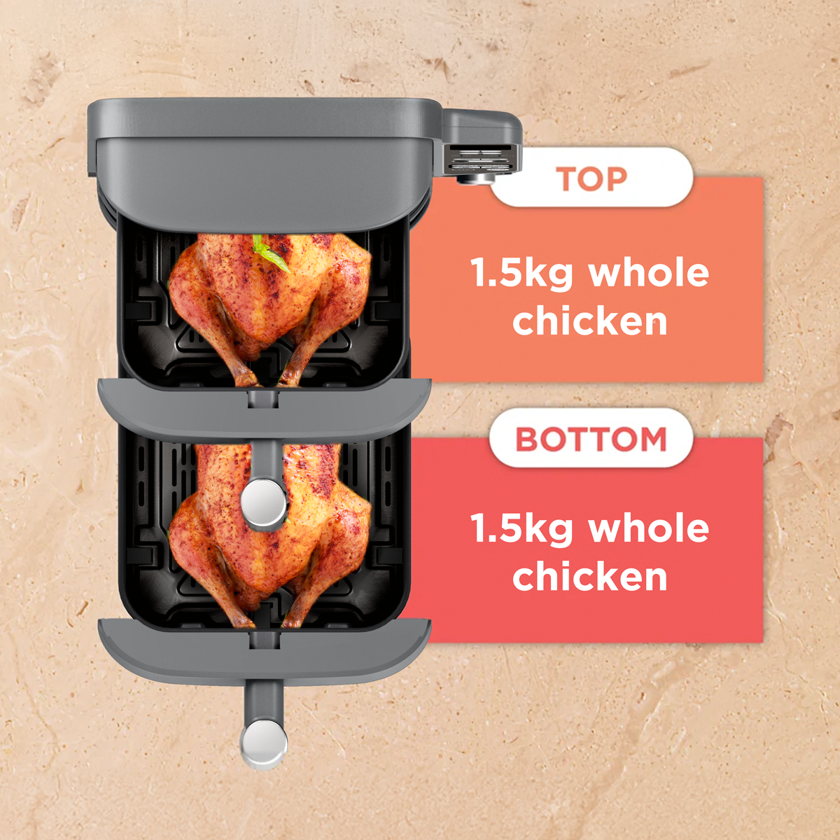 Maximise counter space while giving you the power and capacity of 2 air fryers in the footprint of 1*